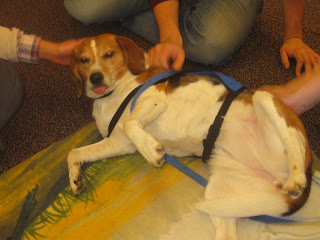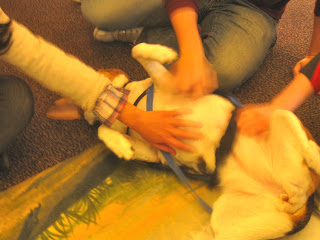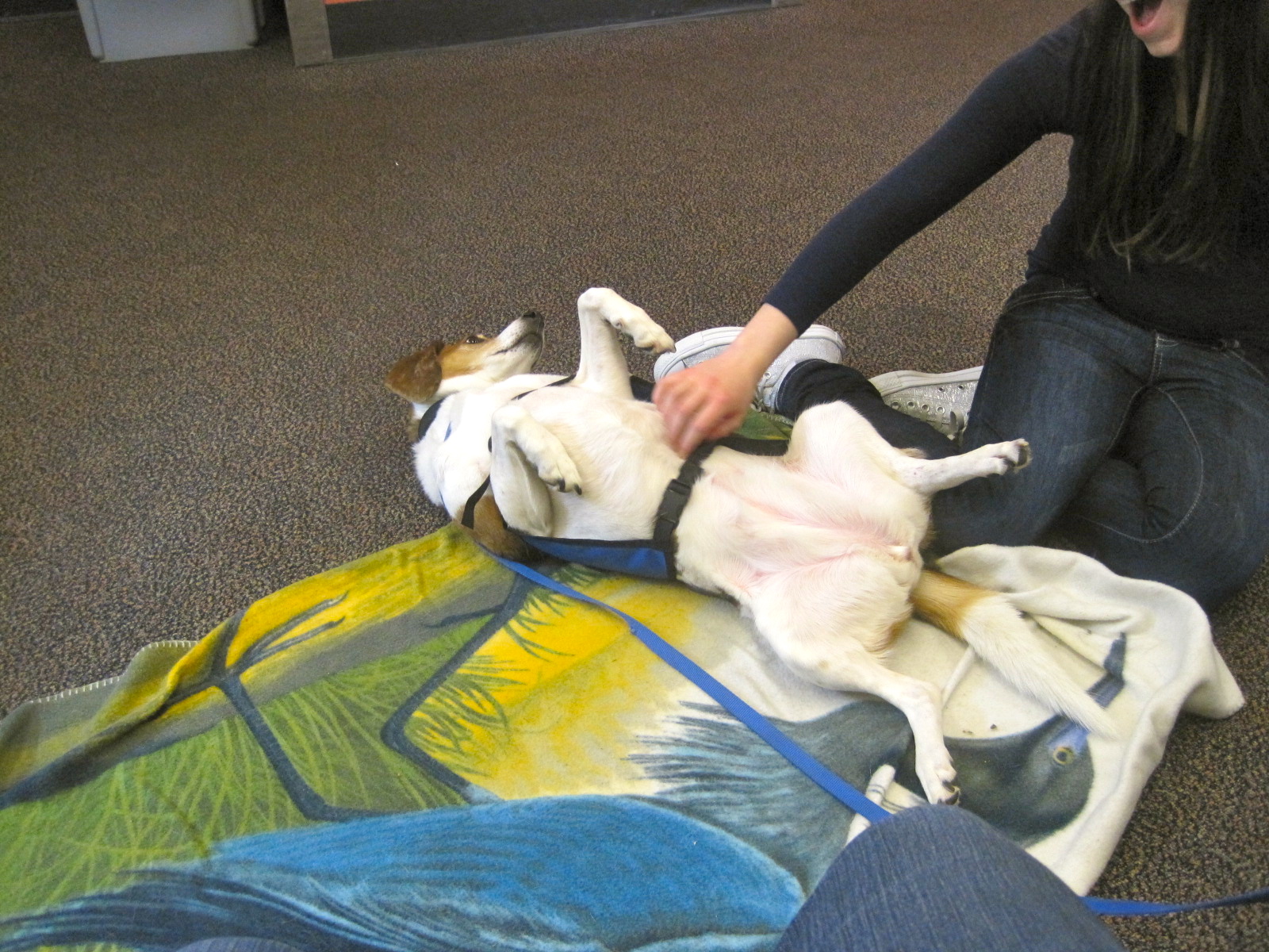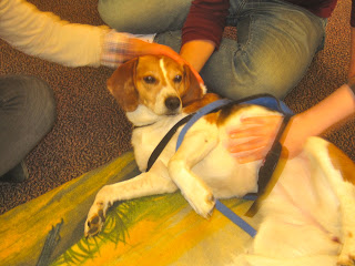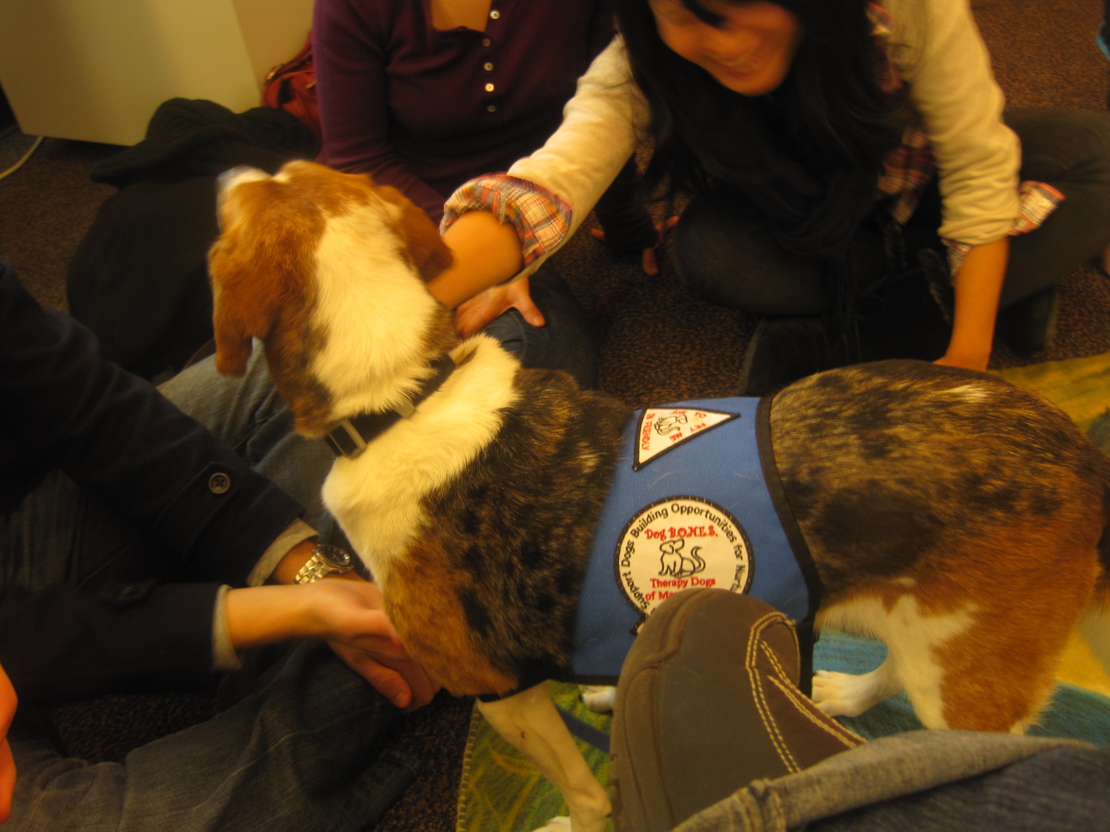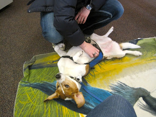 On Dec 20th, Lucy went to MIT to relieve stress for the students during their exams. She and 4 other dogs hung out in the library and attracted quite a crowd. There were so many students who said “Oh, I miss my dog at home!” I think back to when I was in college, and it was the first time since I was born that I was living without a dog/cat/other pet. I was, of course, homesick, and I do think playing with a dog might have made me feel more connected with the “real world”. I hope Lucy did that for the students. As for Lucy – she laid on her back getting belly rubs for nearly 2 hours, getting up only when she heard someone reach into the treat bowl.