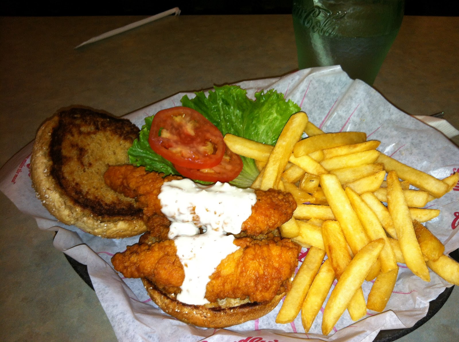 The menu says “Tender, crispy chicken strips tossed in our spicy Buffalo sauce. Topped with lettuce and tomato and covered in Bleu Cheese dressing, served on a soft wheat roll.” I thought the wheat bun would be weird, but it actually wasn’t. The buffalo sauce was…non-existant. The chicken had a hint of spice to it, but there didn’t seem to be any sauce to speak of. Now, I’m a gal who likes her blue cheese, and there was not much of that either!