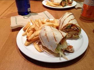 I met Jason for lunch at Lingo (or as I call it, Mango Tango!), which is a little cafeteria/restaurant in the building that he works in. Fortuitously, today they had chicken wraps for lunch! I’ll overlook the fact that the first wrap they made me clearly had tomatoes in it, and when I inquired, they told me it wasn’t tomatoes, it was just part of the buffalo sauce. Um…excuse me??? Don’t pee on my leg and tell me it’s raining!