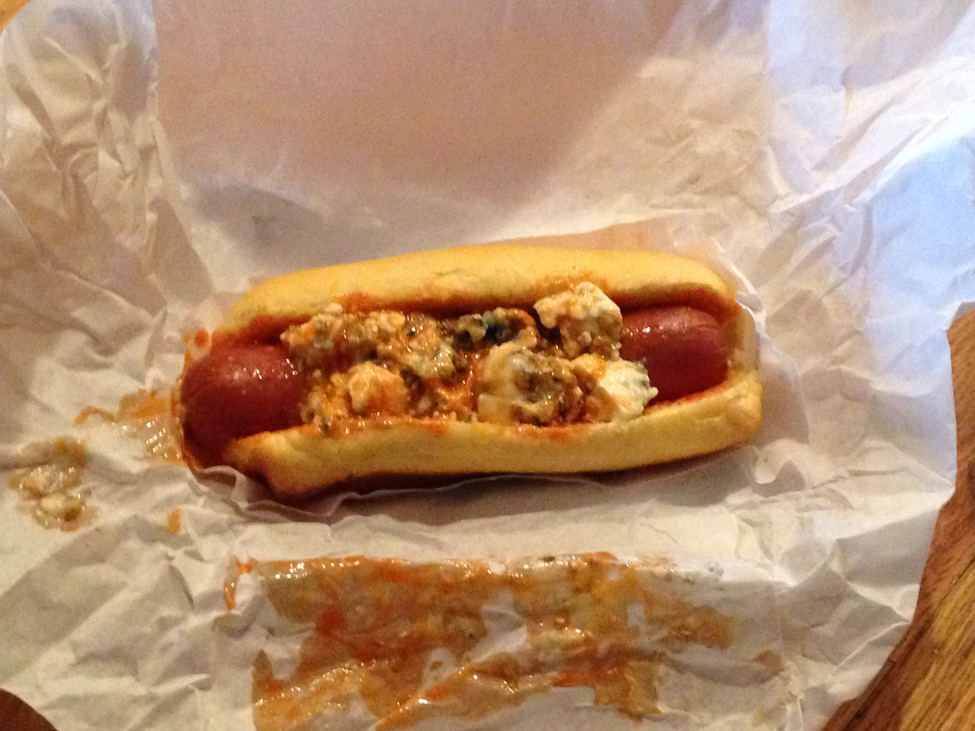 The menu says “Sabrett, Blue Cheese Crumbles, Buffalo Wing Sauce, Green Onion”. I was excited about trying something a little off the beaten path. I like all the ingredients, so why not? Sadly, when my buffalo dog arrived, there were no green onions to be found. I was disappointed, but I persevered.