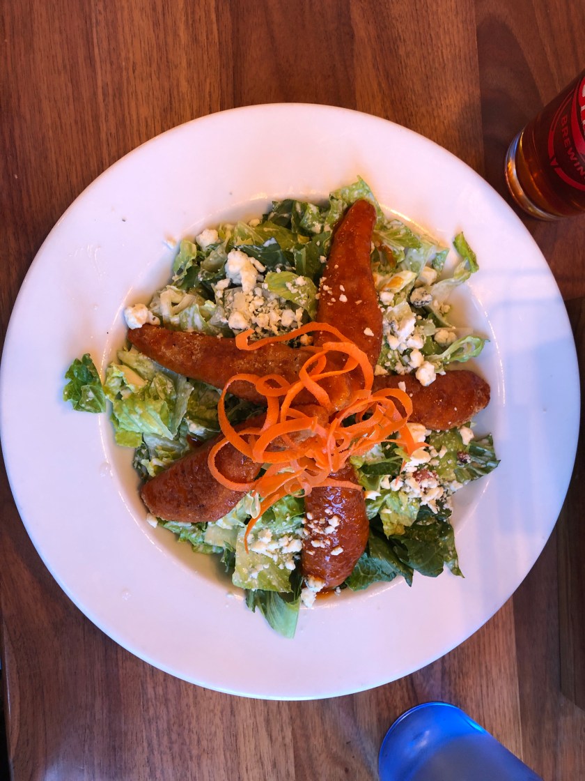 The menu reads: Fresh Romaine dressed in mild blue cheese dressing with blue cheese crumbles, shredded carrots and celery, lightly-crisped chicken tenders in medium spiced buffalo sauce.